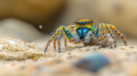 This close-up image showcases a colorful jumping spider on a sandy surface, highlighting its intricate patterns and vibrant hues. Perfect for nature enthusiasts.