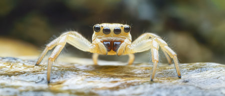 A spider with prominent eyes sits on a rock surrounded by natural elements showcasing its detailed features in bright light.