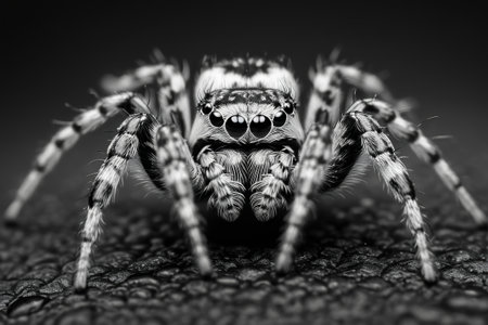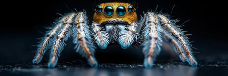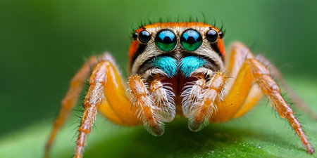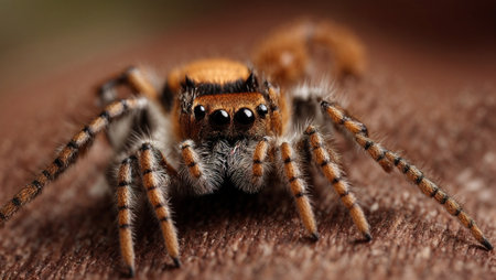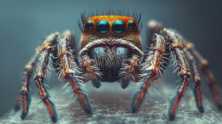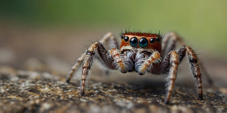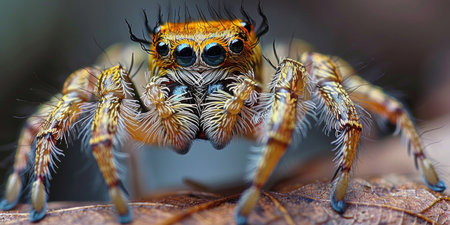 Closeup of a jumping spiders head with symmetrical eyes, arachnid wildlife