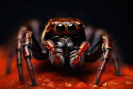 A detailed view of a spider on a piece of food, capturing the arachnid in the act of feasting, Jumping spider macro close-up on a dark background, AI Generated