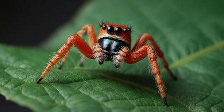 A close-up of a colorful jumping spider on a leaf, showcasing the intricate patterns and vibrant hues of nature's tiny marvels