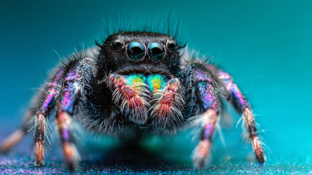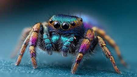This captivating close-up showcases a spider in brilliant colors and intricate details, highlighting the beauty of nature's small creatures.