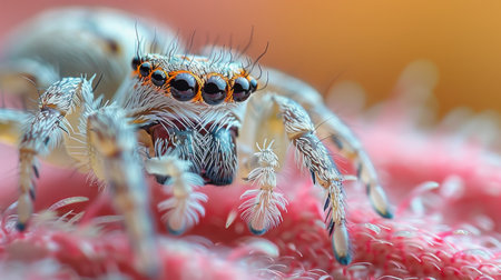 AI Generated. Macro close-up of a jumping spider with bright eyes and long legs crawling on a surface in nature Bright colors