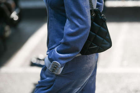 Milan, Italy - September 23, 2021: Street style outfit, woman wearing a fashionable outfit, detail, on the streets of Milan, Italy.