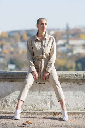 Attractive young woman in overalls rests in public park. Young blonde woman in jumpsuit similar to the uniform sits on retaining wall in park. She sitting with his legs wide apart and looks away