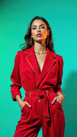 Young hispanic female in stylish red pantsuit against teal background.