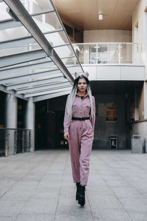 Beautiful cool girl with dreadlocks full length. Photo in the city - urban style