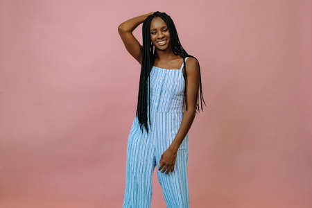 full length shot of african american woman in overalls posing in studio on pink and blue background