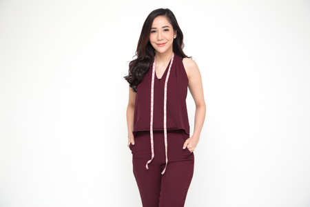 Portrait of a woman fashion designer clothes in red dress with measuring tape isolated over white background, Asian female stylish model