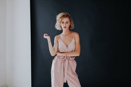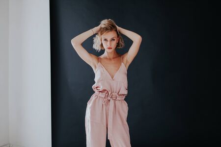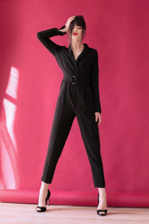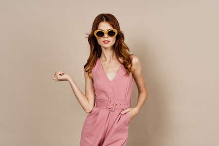 Portrait of a beautiful fashionable woman in a pink jumpsuit