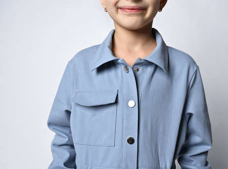 Close-up: a pocket on a denim jacket, overalls, a fragment of a photograph of a girl in a blue jacket with a patch pocket