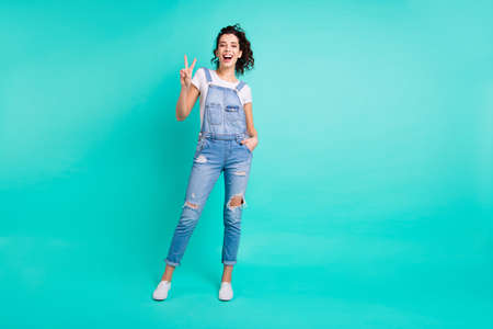 Full length body size photo of charming cute cheerful confident girlfriend with her hands in pocket of jeans overall saying you hi by showing v-sign isolated over turquoise vivid color background