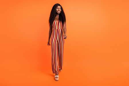 Full body photo of dark skin positive charming lady look empty space walk isolated on orange color background