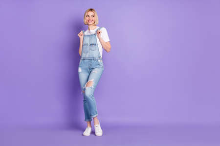 Full size photo of nice optimistic short hairdo blond lady look empty space wear white t-shirt overall isolated on violet background