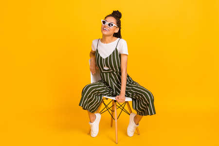 Full length photo of charming dark skin young woman sit chair wear sunglass isolated on yellow color background