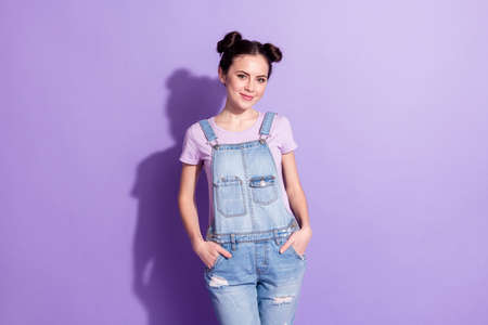 Photo of sweet positive brown hair lady wear t-shirt overall isolated on pastel violet color background