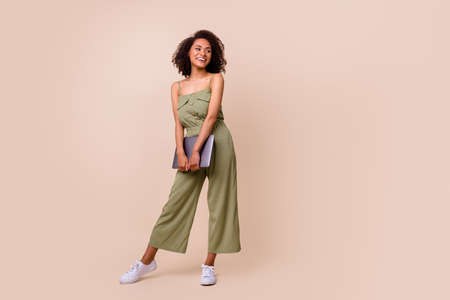 Full length photo of funny brunette woman hold laptop look promo wear overall boots isolated on beige color background