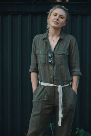 Confident Young Woman in Green Jumpsuit Sitting Against Rustic Blue Metal Background