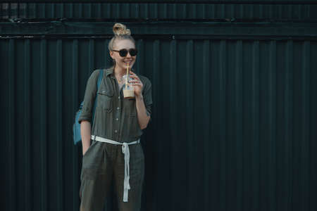 Progressive modern woman, wearing sunglasses, backpack and stylish romper, posing on a dark gray metallic background with copy space while drinking confident a glass of refreshing cold drink.