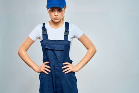 woman in work uniform blue cap service delivery service light background
