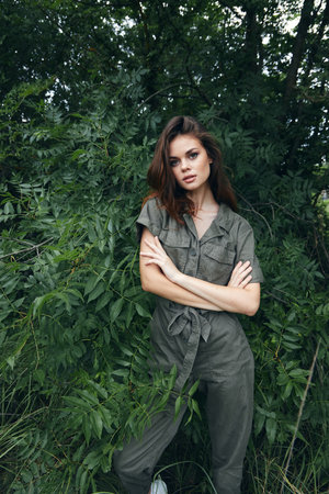 Woman in forest crossed her arms and jumpsuit nature travel