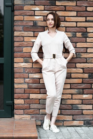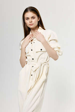 fashionable woman in white jumpsuit portrait cropped view