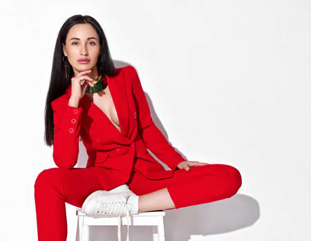 Brunette woman in red pantsuit, jacket with deep neckline on naked body and sneakers sits on a stool, with hand at chin
