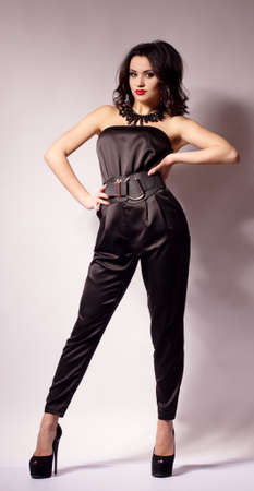 fashion photo of gorgeous woman with dark hair in elegant clothes posing at studio