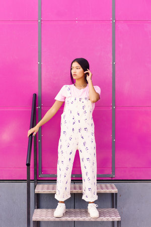 Young Chinese woman with blank stare and serious expression standing against pink wall of modern building. Asian Female in casual clothes.