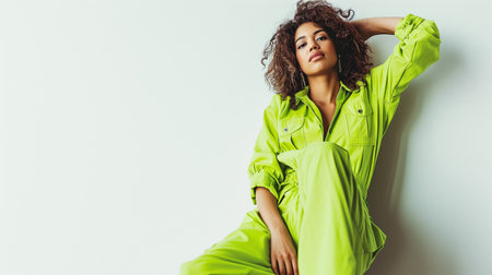 Confident Woman in Green Utility Jumpsuit Posing Against Solid Background