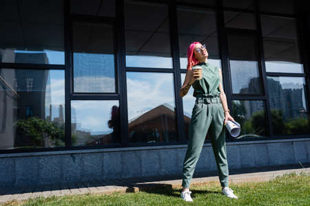 full length of smiling woman with pink hair holding rolled paper and coffee to go outside