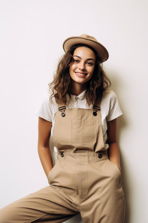 Charming woman in vintage overalls looking at camera Studio shot of smiling stylish african american girl standing in beige background : Generative AI