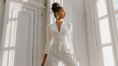 Elegant Woman Posing in White Outfit by Bright Window