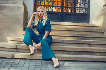 Girl sits on the stairs in a long blue overalls. Blonde with gorgeous red make-up and long legs posing. Model on the background of the campus, student