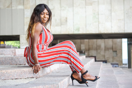 A confident African woman poses on steps, showcasing her vibrant striped jumpsuit and stylish heels. The location features modern architecture, creating a chic atmosphere in the daylight.
