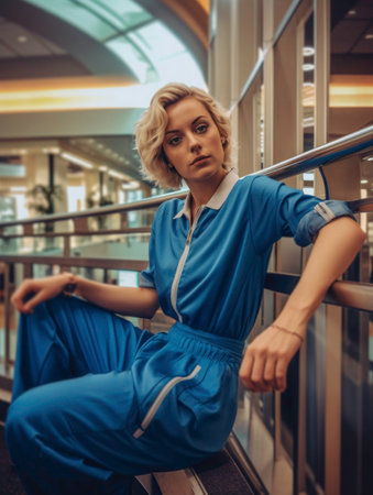 Confident Businesswoman in Elegant Blue Jumpsuit and Glass Lobby generated by AI