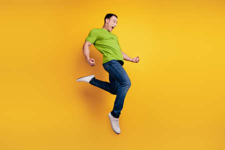 Photo of crazy excited carefree funny man jump open mouth wear casual jeans clothes on yellow background