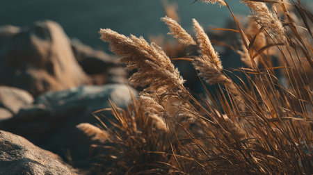 Experience the tranquil beauty of golden grass swaying in a gentle breeze, set against rocky terrain, capturing nature's essence in warm sunlight.