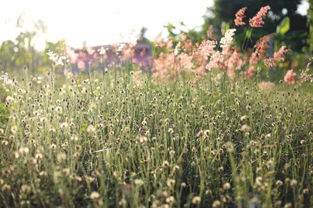 Sunny day on the flowers meadow. Beautiful natural background. Wild plants in nature.