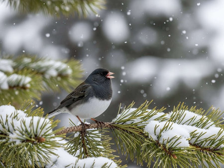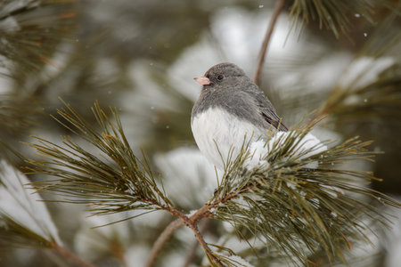 Dark-eyed Junco (junco hyemalis) on a pine branch in the snow.