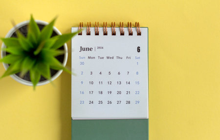 Desk calendar for June 2024 on a yellow background