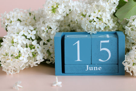 Wooden perpetual calendar showing June 15th with a bouquet of white lilac flowers on a pink background celebrating a summer date