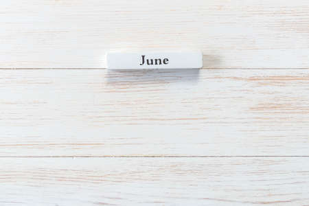 Whine wooden block of calendar with month June on vintage background. Inscription June on wood plank. Top view. Copy space. Mockup for calendar events. This is the one of 12-month series