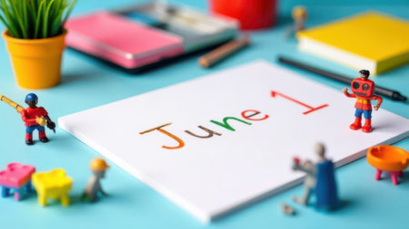 Colorful inscription june 1st is surrounded by miniature workers and stationery on a light blue surface, celebrating the start of a new month