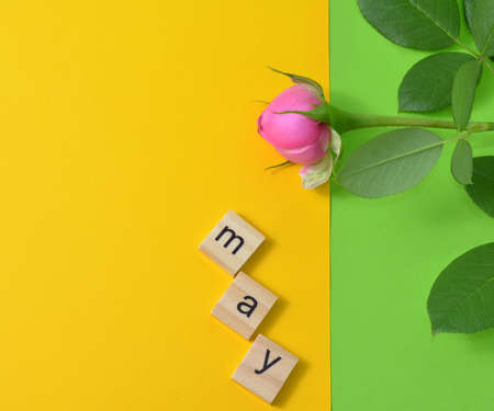 Rose on a green background. The month of May is written in wooden letters. The calendar. Spring. Flowers.