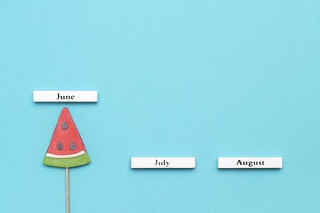 Wooden calendar summer months June, July, August and watermelon lollipop on stick on blue background. Concept vacation, holidays or Hello June. Creative Top view Template.