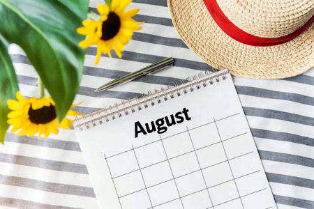 Calendar displaying the month of August with a vibrant sunflower beside it.