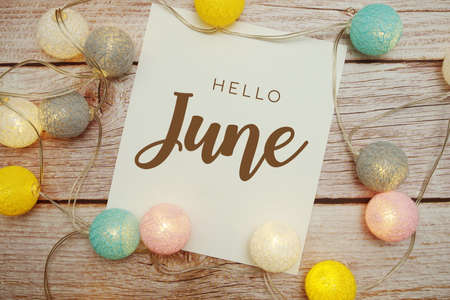 Hello June card typography text with LED cotton ball on wooden background