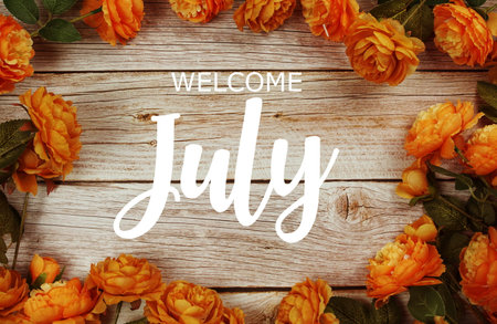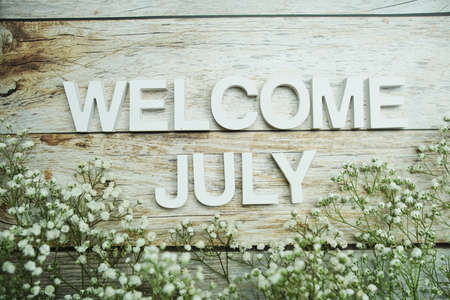 Welcome July alphabet letters with flowers on wooden background