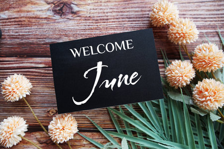 Welcome June text message with flower decoration on wooden background